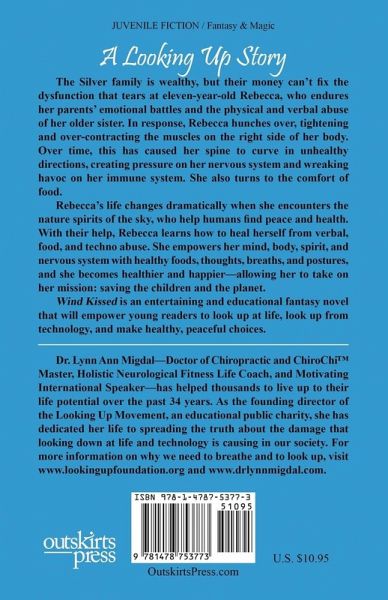 The Silver family is wealthy, but their money can't fix the dysfunction that tears at eleven-year-old Rebecca, who endures her parents' emotional battles and the physical and verbal abuse of her older sister. In response, Rebecca hunches over, tightening and over-contracting the muscles on the right side of her body. Over time, this has caused her spine to curve in unhealthy directions, creating pressure on her nervous system and wreaking havoc on her immune system. She also turns to the comfort of food. Rebecca's life changes dramatically when she encounters the nature spirits of the sky, who help humans find peace and health. With their help, Rebecca learns how to heal herself from verbal, food, and techno abuse. She empowers her mind, body, spirit, and nervous system with healthy foods, thoughts, breaths, and postures, and she becomes healthier and happier-allowing her to take on her mission: saving the children and the planet. Wind Kissed is an entertaining and educational fantasy novel that will empower young readers to look up at life, look up from technology, and make healthy, peaceful choices.