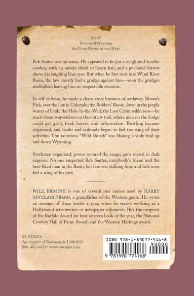 Reb Santee was his name. He appeared to be just a rough-and-tumble cowboy, with an unruly shock of flaxen hair, and a puckered frown in his laughing blue eyes. But when he first rode into Wind River Basin, the law already had a grudge against him—and the grudges multiplied in a hurry, all because he wanted to be honest. In self-defense, he made a chain store business of outlawry. Brown’s Park, over the line in Colorado; the Robbers’ Roost, down in the purple wastes of Utah; the Hole-in-the-Wall; the Lost Cabin wilderness—he made them way stations on the outlaw trail, where men on the dodge could get grub, fresh horses, and information. Rustling became organized; banks and railroads began to feel the sting of their activities. The notorious "Wild Bunch" was blazing a wide trail up and down Wyoming. Stockmen organized; posses scoured the range; guns roared in dark canyons. But no one suspected Reb Santee, everybody’s friend and the best-liked man in the Basin, until one fateful day… Thrills, excitement, romance, and the best assortment of laughs you ever had in a Western story.