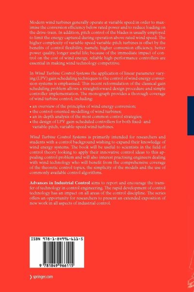 In Wind Turbine Control Systems the application of linearparameter varying (LPV) gain scheduling techniques to the control of wind energy conversion systems is emphasised. This recent reformulation of the classical gain scheduling problem allows a straightforward design procedure and simple controller implementation. The monographprovides a thorough coverage of wind turbine control, including: