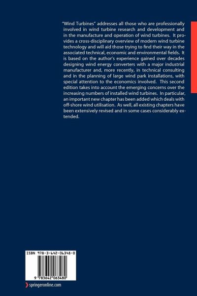 Wind Turbines addresses all those professionally involved in research, development, manufacture and operation of wind turbines. It provides a cross-disciplinary overview of modern wind turbine technology and an orientation in the associated technical, economic and environmental fields. It is based on the author's experience gained over decades designing wind energy converters with a major industrial manufacturer and, more recently, in technical consulting and in the planning of large wind park installations, with special attention to economics. The second edition accounts for the emerging concerns over increasing numbers of installed wind turbines. In particular, an important new chapter has been added which deals with offshore wind utilisation. All advanced chapters have been extensively revised and in some cases considerably extended
