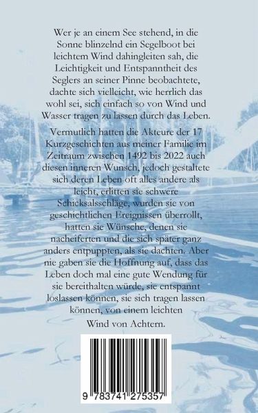 Sieht schon chic aus, dieses schnittige Segelboot, wie es da so am Steg liegt, oder?Aber nein, hier geht es nicht ums Segeln. Vielmehr dem dahinter verborgenen Traum von dieser Leichtigkeit, einer Schwerelosigkeit, einem vermeintlich mühelosen Dahingleiten.Ganz so, wie man sich idealerweise auch sein eigenes Leben vorstellt. Vermutlich hatten die Akteure der 17 Kurzgeschichten aus meiner Familie im Zeitraum zwischen 1492 bis 2022 auch diesen inneren Wunsch, jedoch gestaltete sich deren Leben oft alles andere als leicht, erlitten sie schwere Schicksalsschläge, wurden sie von geschichtlichen Ereignissen überrollt, hatten sie Wünsche, denen sie nacheiferten und die sich später ganz anders entpuppten, als sie dachten. Aber nie gaben sie die Hoffnung auf, dass das Leben doch mal eine gute Wendung für sie bereithalten würde, sie entspannt loslassen können, sie sich tragen lassen können, von einem leichtenWind von Achtern.