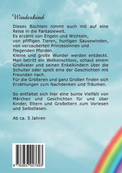 Dieses Büchlein nimmt den Leser mit auf eine Reise in die Fantasiewelt. Es erzählt von Engeln und Wichteln, von pfiffigen Tieren, hurtigen Sausewinden, von verzauberten Prinzessinnen und fliegenden Pferden. Kleine und große Wunder werden entdeckt. Man betritt ein Wolkenschloss, schaut einem Großvater und seinen Enkelkindern über die Schulter oder spielt eine der Geschichten mit Freunden nach. Für die größeren und ganz großen finden sich Erzählungen zum Nachdenken oder Träumen.So findet sich hier eine bunte Vielfalt von Märchen und Geschichten zum Vorlesen und Selbstlesen für und über Kinder, Eltern und Großeltern. Ab ca. 5 Jahren