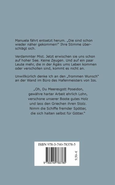 Manuela fährt entsetzt herum. Die sind schon wieder näher gekommen! Ihre Stimme überschlägt sich. Verdammter Mist. Jetzt erwischen sie uns schon auf hoher See. Keine Zeugen. Und auf ein paar Leute mehr, die in der Ägäis ums Leben kommen oder verschollen sind, kommt es janicht an.Unwillkürlich denke ich an den frommen Wunsch an der Wand im Büro des Hafenmeisters von Ios. Oh, Du Meeresgott Poseidon, gewähre harter Arbeit ehrlich Lohn, verschone unserer Boote gutes Holzund lass den Griechen ihren Stolz.Nimm die Schiffe fremder Spötter,die sich halten selbst für Götter.