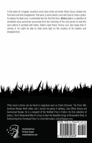 Selected as one of PopMatters 2023 Best Books, WINDOW EYES is a must-read. Jennifer Vega wrote, "The depth and complexity of Philip Jason's Window Eyes become fully apparent when we step back and think about the many stories he has folded into one, the laminated, exponential layers of storytelling created by his frame structure and secondary narrator. In the outermost layer of Window Eyes, we are reading a novel about a man telling us about his friend's book. Go in one layer, and we are reading that re-telling. In still a third layer, the unnamed protagonist of Kellan's book tells his golem the story of the hero Window Eyes, who has vanished and is being forever sought by Glassman, who loves her." In the wake of a tragedy, eccentric comic book artist and writer Kellan Savoy created one final work and then disappeared. That work, a series about a man who tries to make a golem to replace his dead lover, is presented here for the first time: Window Eyes is a collection of annotated issue summaries summoned from the memories of the only person to read the work before it vanished with Kellan, Kellan's best friend Thomas Levi, who hopes that in sharing it, he might be able to shed some light on the mystery of its creation and disappearance.
