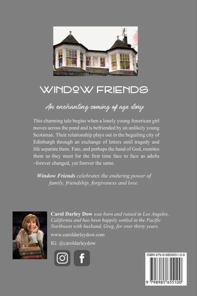 Window Friends is a charming tale of a lonely young American girl who moves across the pond with her father, who has just been made the new head of the US Consulate in Edinburgh. She is befriended by an unlikely young Scotsman who waves to her from a third story window. Their relationship grows and plays against the background of the beguiling old city through an exchange of notes and letters. Tragedy and the complications of life separate them, until fate and perhaps the hand of God reunites them. They finally meet face to face for the first time as young adults-forever changed, yet forever the same. Window Friends celebrates the enduring power of family, friendship, forgiveness and love. Each chapter heading features an original pen and ink drawing by the author.