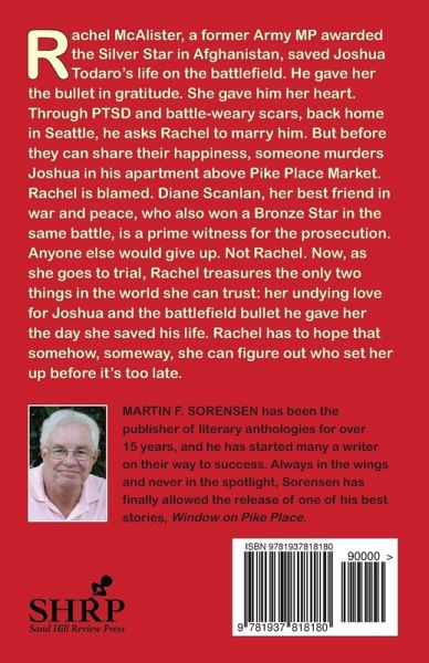 Rachel McAlister saves Joshua Todaro's life on an Afghanistan battlefield. Back home in Seattle, he asks her to marry him. But someone murders Joshua in his Pike Place apartment and frames Rachel. On trial, she holds on to the only two things in the world that she can trust: her love for Joshua, and the battlefield bullet he gave her. She has to hope she can figure out who set her up before it's too late.