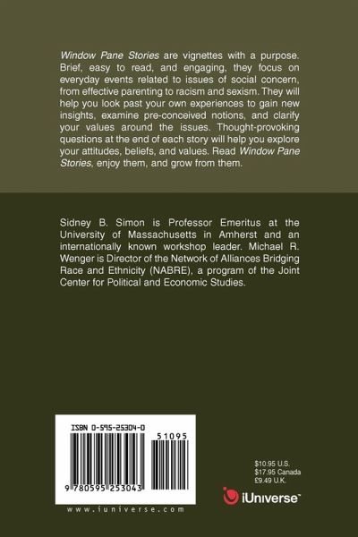 Window Pane Stories are vignettes with a purpose. Brief, easy to read, and engaging, they focus on everyday events related to issues of social concern, from effective parenting to racism and sexism. They will help you look past your own experiences to gain new insights, examine pre-conceived notions, and clarify your values around the issues. Thought-provoking questions at the end of each story will help you explore your attitudes, beliefs, and values. Read Window Pane Stories and grow from them.