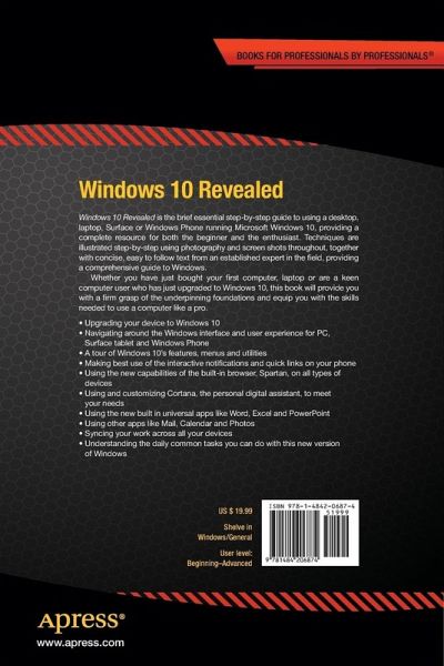 Windows 10 Revealed is your essential step-by-step guide to using a desktop, laptop, Surface or Windows Phone running Microsoft Windows 10, providing a complete resource for both the beginner and the enthusiast. Techniques are illustrated step-by-step using photography and screen shots throughout, together with concise, easy to follow text from an established expert in the field, providing a comprehensive guide to Windows.