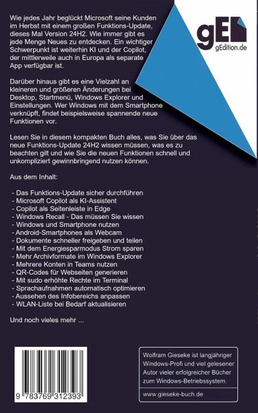 Wie jedes Jahr beglückt Microsoft seine Kunden im Herbst mit einem großen Funktions-Update, dieses Mal Version 24H2. Wie immer gibt es jede Menge Neues zu entdecken. Ein wichtiger Schwerpunkt ist weiterhin KI und der Copilot, der mittlerweile auch in Europa als separate App verfügbar ist. Darüber hinaus gibt es eine Vielzahl an kleineren und größeren Änderungen bei Desktop, Startmenü, Windows Explorer und Einstellungen. Wer Windows mit dem Smartphone verknüpft, findet beispielsweise spannende neue Funktionen vor. Auch Änderungen unter der Haube werden vorgestellt. Windows Recall bleibt den Anwendern zumindest vorerst vorenthalten oder erspart - je nach Sichtweise. Aber auch darauf geht das Buch ein und zeigt Ihnen, wie Sie Vorkehrungen gegen diese Funktion treffen können, wenn die Datenschutzbedenken überwiegen. Lesen Sie in diesem kompakten Buch alles, was Sie über das neue Funktions-Update 24H2 wissen müssen, was es zu beachten gilt und wie Sie die neuen Funktionen schnell und unkompliziert gewinnbringend nutzen können. Aus dem Inhalt: - Das Funktions-Update sicher durchführen - Microsoft Copilot als KI-Assistent - Copilot als Seitenleiste in Edge - Windows Recall - Das müssen Sie wissen - Windows und Smartphone nutzen - Android-Smartphones als Webcam - Dokumente schneller freigeben und teilen - Mit dem Energiesparmodus Strom sparen - Mehr Archivformate im Windows Explorer - Mehrere Konten in Teams nutzen - QR-Codes für Webseiten generieren - Mit sudo erhöhte Rechte im Terminal - Sprachaufnahmen automatisch optimieren - Aussehen des Infobereichs anpassen - WLAN-Liste bei Bedarf aktualisieren Und noch vieles mehr ...