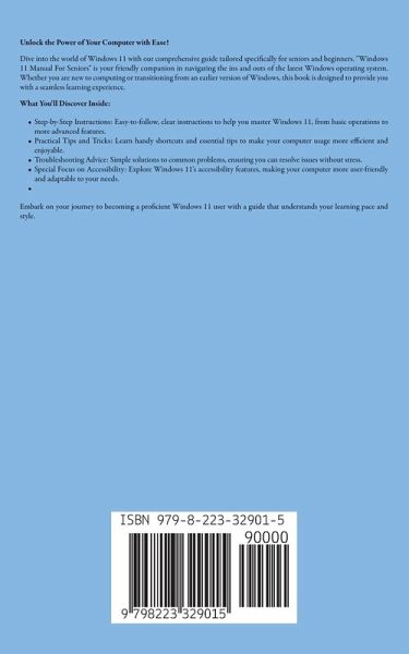 Unlock the Power of Your Computer with Ease! Dive into the world of Windows 11 with our comprehensive guide tailored specifically for seniors and beginners. "Windows 11 Manual For Seniors" is your friendly companion in navigating the ins and outs of the latest Windows operating system. Whether you are new to computing or transitioning from an earlier version of Windows, this book is designed to provide you with a seamless learning experience. What You'll Discover Inside:Step-by-Step Instructions: Easy-to-follow, clear instructions to help you master Windows 11, from basic operations to more advanced features. Practical Tips and Tricks: Learn handy shortcuts and essential tips to make your computer usage more efficient and enjoyable. Troubleshooting Advice: Simple solutions to common problems, ensuring you can resolve issues without stress. Special Focus on Accessibility: Explore Windows 11's accessibility features, making your computer more user-friendly and adaptable to your needs. Embark on your journey to becoming a proficient Windows 11 user with a guide that understands your learning pace and style.