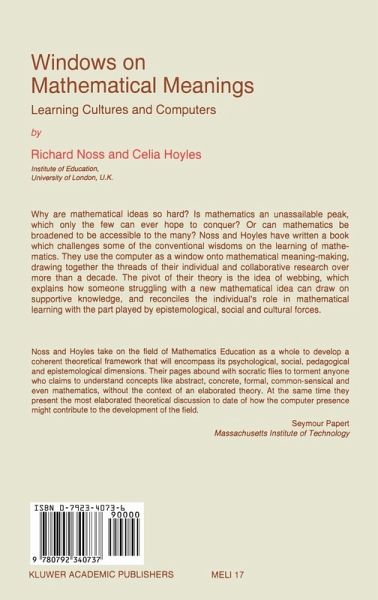 "Noss and Hoyles take on the field of Mathematics Education as a whole to develop a coherent theoretical framework that will encompass its psychological, social, pedagogical and epistemological dimensions. Their pages abound with socratic flies to torment anyone who claims to understand concepts like abstract, concrete, formal, common-sensical and even mathematics, without the context of an elaborated theory. At the same time they present the most elaborated theoretical discussion to date of how the computer presence might contribute to the development of the field."
