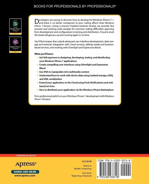Developers are racing to discover how to develop for Windows Phone 7-and there is no quicker resource to help you get up to speed than Windows Phone 7 Recipes. This book covers all aspects of development, configuration, testing, and distribution, with detailed code samples and rapid walkthroughs to support you every step of the way.