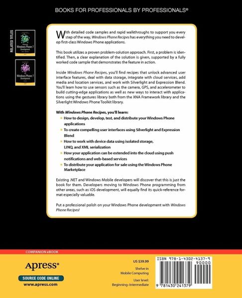 Windows Phone Recipes utilizes a proven problem-solution approach, providing a concise guide to all the phone s features in recipe book format. First, the problem you're facing is identified. Then, a clear explanation of the solution is given, supported by a fully-worked code sample that demonstrates the feature in action.