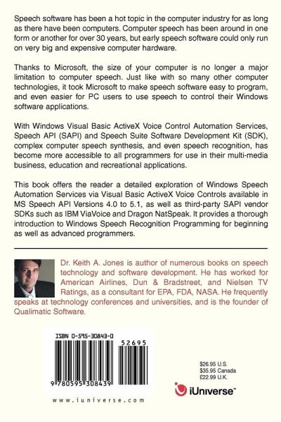 Speech software has been a hot topic in the computer industry for as long as there have been computers. Computer speech has been around in one form or another for over 30 years, but early speech software could only run on very big and expensive computer hardware. Thanks to Microsoft, the size of your computer is no longer a major limitation to computer speech. Just like with so many other computer technologies, it took Microsoft to make speech software easy to program, and even easier for PC users to use speech to control their Windows software applications. With Windows Visual Basic ActiveX Voice Control Automation Services, Speech API (SAPI) and Speech Suite Software Development Kit (SDK), complex computer speech synthesis, and even speech recognition, has become more accessible to all programmers for use in their multi-media business, education and recreational applications. This book offers the reader a detailed exploration of Windows Speech Automation Services via Visual Basic ActiveX Voice Controls available in MS Speech API Versions 4.0 to 5.1, as well as third-party SAPI vendor SDKs such as IBM ViaVoice and Dragon NatSpeak. It provides a thorough introduction to Windows Speech Recognition Programming for beginning as well as advanced programmers.