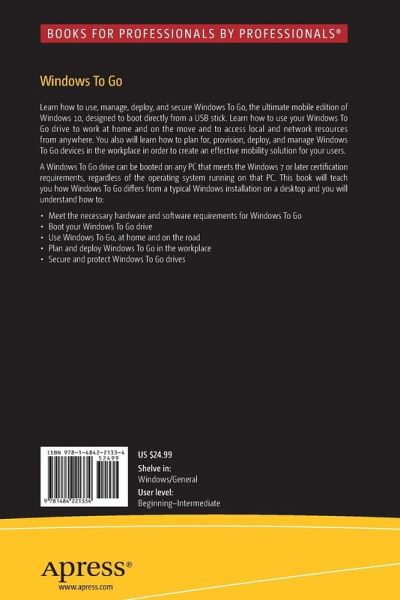 Find out how to use, manage, deploy, and secure Windows To Go, the ultimate mobile edition of Windows 10, designed to boot directly from a USB stick. This book shows you how to use your Windows To Go drive to work at home and on the move and access local and network resources from anywhere. Readers responsible for deploying Windows To Go drives will also learn how to plan for, provision, deploy, and manage Windows To Go devices in the workplace in order to create an effective mobility solution for their users.