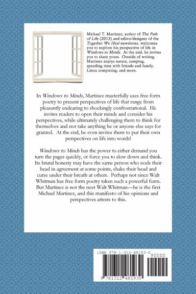 In Windows to Minds, Martinez masterfully uses free form poetry to present perspectives of life that range from pleasantly endearing to shockingly confrontational. He invites readers to open their minds and consider his perspectives, while ultimately challenging them to think for themselves and not take anything he or anyone else says for granted. At the end, he even invites them to put their own perspectives on life into words! Windows to Minds has the power to either demand you turn the pages quickly, or force you to slow down and think. Its brutal honesty may have the same person who nods their head in agreement at some points, shake their head and curse under their breath at others. Perhaps not since Walt Whitman has free form poetry taken such a powerful form. But Martinez is not the next Walt Whitman-he is the first Michael Martinez, and this manifesto of his opinions and perspectives attests to this.