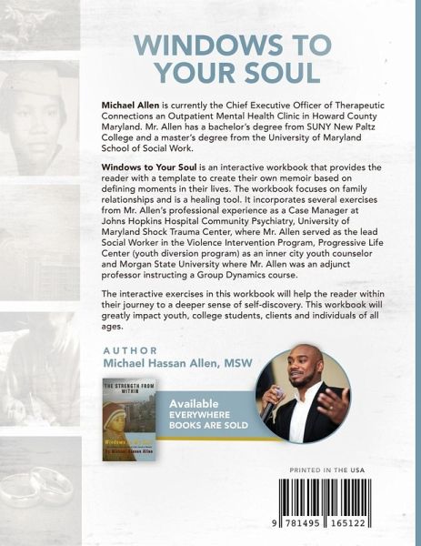 Michael Allen is currently the Chief Executive Officer of Therapeutic Connections an Outpatient Mental Health Clinic in Howard County Maryland. Mr. Allen has a bachelor's degree from SUNY New Paltz College and a master's degree from the University of Maryland School of Social Work. Windows to Your Soul is an interactive workbook that provides the reader with a template to create their own memoir based on defining moments in their lives. The workbook focuses on family relationships and is a healing tool. It incorporates several exercises from Mr. Allen's professional experience as a Case Manager at Johns Hopkins Hospital Community Psychiatry, University of Maryland Shock Trauma Center, where Mr. Allen served as the lead Social Worker in the Violence Intervention Program, Progressive Life Center (youth diversion program) as an inner city youth counselor and Morgan State University where Mr. Allen was an adjunct professor instructing a Group Dynamics course. The interactive exercises in this workbook will help the reader within their journey to a deeper sense of self-discovery. This workbook will greatly impact youth, college students, clients and individuals of all ages.