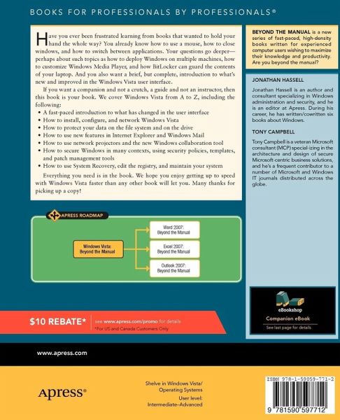 Windows Vista provides a range of new capabilities and features, many of which are apparent through a totally redesigned interface, and many more that are hidden just beneath the surface. With the help of Windows Vista: Beyond the Manual, IT professionals and home PC enthusiasts alike will become expert users, taking full advantage of the myriad functions and features that make up this release. Noted authors Jonathan Hassell and Tony Campbell pack this book full of their own experience, plus hundreds of hints, tips, and walkthroughs, making it an indispensable companion that wont waste your time. A one-stop shop for geeks and knowledgeable users getting to know Windows Vista. The authors walk you through practically every useful function. All versions of Windows Vista are covered and analyzed, and recommendations are offered. The book devotes a section to next-generation Media Center. A complete "Where Am I" guide is included for new Vista users. Domain integration and unattended installation are also covered in detail.