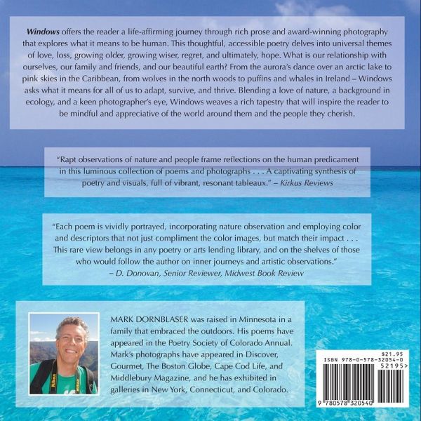 Windows offers the reader a life-affirming journey, through rich prose and award-winning photography that explores what it means to be human. This thoughtful, accessible poetry delves into universal themes of love, loss, growing older, growing wiser, regret, and ultimately, hope. What is our relationship with ourselves, our family and friends, and this beautiful earth? From the aurora's dance over an arctic lake to snowmelt streams in the Rockies, from wolves in the north woods to pink skies in the Caribbean, from hurricanes on the Outer Banks to puffins and whales in Ireland - Windows asks what it means for all of us to adapt, survive, and thrive. With a love of nature, a background in ecology, and a keen photographer's eye, Windows weaves a rich tapestry that will remind the reader to be mindful and appreciative of the world around them and the people they cherish.