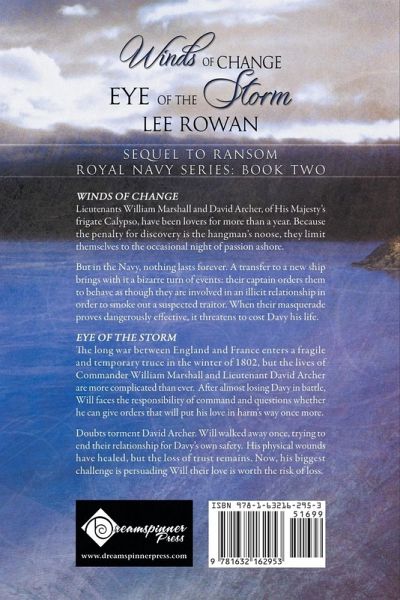 Sequel to RansomRoyal Navy Series: Book Two Winds of Change Lieutenants William Marshall and David Archer, of His Majesty's frigate Calypso, have been lovers for more than a year. Because the penalty for discovery is the hangman's noose, they limit themselves to the occasional night of passion ashore. But in the Navy, nothing lasts forever. A transfer to a new ship brings with it a bizarre turn of events: their captain orders them to behave as though they are involved in an illicit relationship in order to smoke out a suspected traitor. When their masquerade proves dangerously effective, it threatens to cost Davy his life. Eye of the Storm The long war between England and France enters a fragile and temporary truce in the winter of 1802, but the lives of Commander William Marshall and Lieutenant David Archer are more complicated than ever. After almost losing Davy in battle, Will faces the responsibility of command and questions whether he can give orders that will put his love in harm's way once more. Doubts torment David Archer. Will walked away once, trying to end their relationship for Davy's own safety. His physical wounds have healed, but the loss of trust remains. Now, his biggest challenge is persuading Will their love is worth the risk of loss.