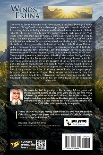 The world of Eruna, where the wind never ceases, is inhabited by winged beings (known as "Wings") and beings without wings (known derogatively as "Grubs"). Every winged child in the Eight Realms and Northern Provinces is sent to Cliffside School by the age of eight to be educated and prepared to participate in the Wind Trials, which they must pass to become a Wind Dancer and be allowed to study magic. The three gigantic trees of Cliffside have been "seen" by a gifted young winglet far, far to the north, who is determined to make her way to Cliffside. She elicits the aid of her grandfather, the leader of the Clans of the Northern Plateaus, and several warriors, to accompany her on her perilous journey. At Cliffside, two eighth-level students have undergone the "Desideratum" in which they have become irrevocably bound together by love to be eventually joined as life-mates. The young wingwoman is the daughter of the High Matriarch of the Eight Realms, who has dark plans for Eruna and whose use of dark magic has corrupted her. The young wingman is the son of the Patriarch of the lowliest Tree in the land due to the actions of an ancestor, who seeks to return to Eruna with the help of a powerful demonic creature, to exact revenge on those whom he believes betrayed him. Living between the roots of the giant trees of Eruna, the wingless people have been made to serve the Winged. Their lives are not their own, but they find joy and happiness despite their enslavement. One such young man finds his plans for a bright future blown away during the Turn of Winds and sets out on a journey of his own.
