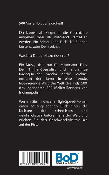 500 Meilen bis zur Ewigkeit!Du kannst als Sieger in die Geschichte eingehen oder als Niemand vergessen werden. Ein Fehler kann Dich das Rennen kosten ... oder Dein Leben.Was bist Du bereit, zu riskieren?Ein Muss, nicht nur für Motorsport-Fans. Der Thriller-Spezialist und langjährige Racing-Insider Sascha André Michael entführt den Leser in eine fremde, faszinierende Welt: die Welt des Indy 500, des legendären 500 Meilen-Rennens von Indianapolis.Werfen Sie in diesem High-Speed-Roman einen actiongeladenen Blick hinter die Kulissen des schnellsten und gefährlichsten Autorennens der Welt und erleben Sie den Geschwindigkeitsrausch auf der Piste.