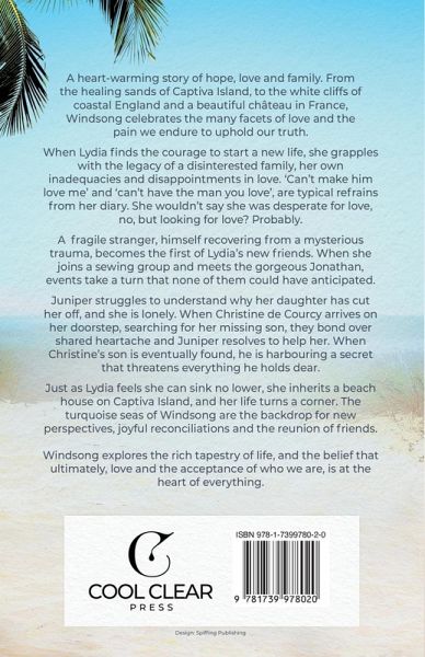 A heart-warming story of hope, love and family. From the healing sands of Captiva Island, to the white cliffs of coastal England and a beautiful château in France, Windsong celebrates the many facets of love and the pain we endure to uphold our truth. When Lydia finds the courage to start a new life, she grapples with the legacy of a disinterested family, her own inadequacies and disappointments in love. 'Can't make him love me' and 'can't have the man you love',are typical refrains from her diary. She wouldn't say she was desperate for love, no, but looking for love? Probably. A fragile stranger, himself recovering from a mysterious trauma, becomes the first of Lydia's new friends. When she joins a sewing group and meets the gorgeous Jonathan, events take a turn that none of them could have anticipated. Juniper struggles to understand why her daughter has cut her off, and she is lonely. When Christine de Courcy arrives on her doorstep, searching for her missing son, they bond over shared heartache and Juniper resolves to help her. When Christine's son is eventually found, he is harbouring a secret that threatens everything he holds dear. Just as Lydia feels she can sink no lower, she inherits a beach house on Captiva Island, and her life turns a corner. The turquoise seas of Windsong are the backdrop for new perspectives, joyful reconciliations and the reunion of friends. Windsong explores the rich tapestry of life, and the belief that ultimately, love and the acceptance of who we are, is at the heart of everything.