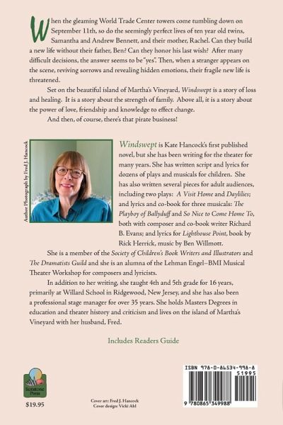 When the gleaming World Trade Center towers come tumbling down on September 11th, so do the seemingly perfect lives of ten year old twins, Samantha and Andrew Bennett, and their mother, Rachel. Can they build a new life without their father, Ben? Can they honor his last wish? After many difficult decisions, the answer seems to be "yes." Then, when a stranger appears on the scene, reviving sorrows and revealing hidden emotions, their fragile new life is threatened. Set on the beautiful island of Martha's Vineyard, Windswept is a story of loss and healing. It is a story about the strength of family. Above all, it is a story about the power of love, friendship and knowledge to effect change. And then, of course, there's that pirate business! Includes Readers Guide. "Windswept" is Kate Hancock's first published novel, but she has been writing for the theater for many years. She has written script and lyrics for dozens of plays and musicals for children. She has also written several pieces for adult audiences, including two plays: "A Visit Home" and "Daylilies"; and lyrics and co-book for three musicals: "The Playboy of Ballyduff" and "So Nice to Come Home To," both with composer and co-book writer Richard B. Evans; and lyrics for "Lighthouse Point," book by Rick Herrick, music by Ben Willmott. She is a member of the Society of Children's Book Writers and Illustrators and The Dramatists Guild and she is an alumna of the Lehman Engel-BMI Musical Theater Workshop for composers and lyricists. In addition to her writing, she taught 4th and 5th grade for 16 years, primarily at Willard School in Ridgewood, New Jersey, and she has also been a professional stage manager for over 35 years. She holds Masters Degrees in education and theater history and criticism and lives on the island of Martha's Vineyard with her husband, Fred.