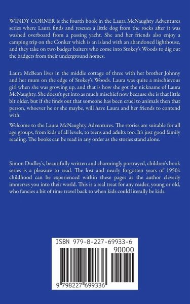 WINDY CORNER is the fourth book in the Laura McNaughty Adventures series where Laura finds and rescues a little dog from the rocks after it was washed overboard from a passing yacht. She and her friends also enjoy a camping trip on the Conker which is an island with an abandoned lighthouse, and they take on two badger baiters who come into Stokey's Woods to dig out the badgers from their underground homes. Laura McBean lives in the middle cottage of three with her brother Johnny and her mum on the edge of Stokey's Woods. Laura was quite a mischievous girl when she was growing up, and that is how she got the nickname of Laura McNaughty. She doesn't get into as much mischief now because she is that little bit older, but if she finds out that someone has been cruel to animals then that person, whoever he or she maybe, will have Laura and her friends to contend with. Welcome to the Laura McNaughty Adventures. The stories are suitable for all age groups, from kids of all levels, to teens and adults too. It's just good family reading. The books can be read in any order as the stories stand alone. Simon Dudley's, beautifully written and charmingly portrayed, children's book series is a pleasure to read. The lost and nearly forgotten years of 1950's childhood can be experienced within these pages as the author cleverly immerses you into their world. This is a real treat for any reader, young or old, who fancies a bit of time travel back to when kids could literally be kids.