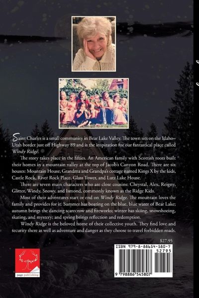 Saint Charles is a small community in Bear Lake Valley. The town sits on the Idaho-Utah border just off Highway 89 and is the inspiration for our fantastical place called Windy Ridge. The story takes place in the fifties. An American family with Scottish roots built their homes in a mountain valley at the top of Jacob's Canyon Road. There are six houses: Mountain House, Grandma and Grandpa's cottage named Kings X by the kids, Castle Rock, River Rock Place, Glass Tower, and Lutz Lake House. There are six main characters who are close cousins: Chrystal, Alex, Reigny, Glitter, Windy, Snowy, and Ismond, commonly known as the Ridge Kids. Most of their adventures start or end on Windy Ridge. The mountain loves the family and provides for it. Summer has boating on the blue, blue water of Bear Lake; autumn brings the dancing scarecrow and fireworks; winter has skiing, snowshoeing, skating, and mystery; and spring brings reflection and redemption. Windy Ridge is the beloved home of their collective youth. They find love and security there as well as adventure and danger as they choose to travel forbidden roads.