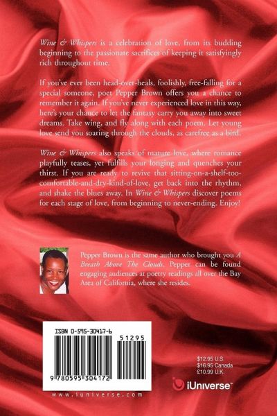 Wine & Whispers is a celebration of love, from its budding beginning to the passionate sacrifices of keeping it satisfyingly rich throughout time. If you've ever been head-over-heals, foolishly, free-falling for a special someone, poet Pepper Brown offers you a chance to remember it again. If you've never experienced love in this way, here's your chance to let the fantasy carry you away into sweet dreams. Take wing, and fly along with each poem. Let young love send you soaring through the clouds, as carefree as a bird. Wine & Whispers also speaks of mature love, where romance playfully teases, yet fulfills your longing and quenches your thirst. If you are ready to revive that sitting-on-a-shelf-too-comfortable-and-dry-kind-of-love, get back into the rhythm, and shake the blues away. In Wine & Whispers discover poems for each stage of love, from beginning to never-ending. Enjoy!
