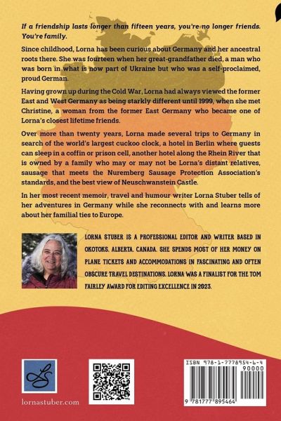 If a friendship lasts longer than fifteen years, you're no longer friends. You're family. Since childhood, Lorna has been curious about Germany and her ancestral roots there. She was fourteen when her great-grandfather died, a man who was born in what is now part of Ukraine but who was a self-proclaimed, proud German. Having grown up during the Cold War, Lorna had always viewed the former East and West Germany as being starkly different until 1999, when she met Christine, a woman from the former East Germany who became one of Lorna's closest lifetime friends. Over twenty-five years, Lorna made several trips to Germany in search of the world's largest cuckoo clock, a hotel in Berlin where guests can sleep in a coffin or prison cell, another hotel along the Rhein River that is owned by a family who may or may not be Lorna's distant relatives, sausage that meets the Nuremberg Sausage Protection Association's standards, and the best view of Neuschwanstein Castle. In her most recent memoir, travel and humour writer Lorna Stuber tells of her adventures in Germany while she reconnects with and learns more about her familial ties to Europe.