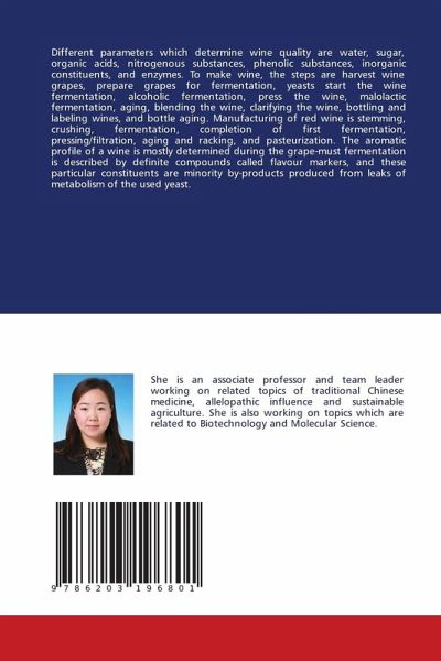 Different parameters which determine wine quality are water, sugar, organic acids, nitrogenous substances, phenolic substances, inorganic constituents, and enzymes. To make wine, the steps are harvest wine grapes, prepare grapes for fermentation, yeasts start the wine fermentation, alcoholic fermentation, press the wine, malolactic fermentation, aging, blending the wine, clarifying the wine, bottling and labeling wines, and bottle aging. Manufacturing of red wine is stemming, crushing, fermentation, completion of first fermentation, pressing/filtration, aging and racking, and pasteurization. The aromatic profile of a wine is mostly determined during the grape-must fermentation is described by definite compounds called flavour markers, and these particular constituents are minority by-products produced from leaks of metabolism of the used yeast.