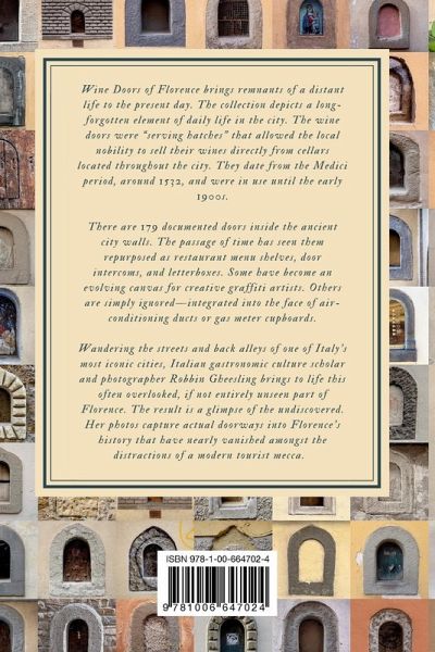 There are over 150 tiny historic doors (buchette del vino) hiding in plain sight in the city streets of Florence. Called wine doors (or wine windows) in English, these little portals allowed the noble families of Florence to sell their agricultural products directly to the common citizens in the era of Cosimo I de Medici, Grand Duke of Tuscany. This award-winning photography collection brings these long-forgotten elements of daily life to the present day and demonstrates the passage of time where they have been repurposed as restaurant menu shelves, door intercoms, and letterboxes. Some have become an evolving canvas for creative graffiti artists. This book captures a glimpse of the undiscovered history of Florence, actual doorways that have nearly vanished amongst the distractions of a modern tourist mecca.