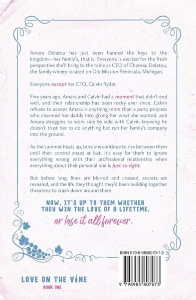 This alternate cover edition features a full-length bonus chapter plus updated interior formatting! Amara Delatou has just been handed the keys to the kingdom-her family's, that is. Everyone is excited for the fresh perspective she'll bring to the table as CEO of Chateau Delatou, the family winery located on Old Mission Peninsula, Michigan. Everyone except her CFO, Calvin Ryder. Five years ago, Amara and Calvin had a moment that didn't end well, and their relationship has been rocky ever since. Calvin refuses to accept Amara is anything more than a party princess who charmed her daddy into giving her what she wanted, and Amara struggles to work side by side with Calvin knowing he doesn't trust her to do anything but run her family's company into the ground. As the summer heats up, tensions continue to rise between them until their control snaps at last. It's easy for them to ignore everything wrong with their professional relationship when everything about their personal one is just so right. But before long, lines are blurred and crossed, secrets are revealed, and the life they thought they'd been building together threatens to crash down around them. Now, it's up to them whether they win the love of a lifetime, or lose it all forever.