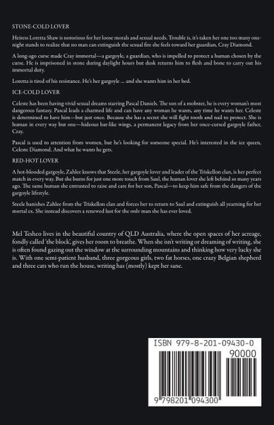 STONE-COLD LOVER Book One in the Winged & Dangerous series: Heiress Loretta Shaw is notorious for her loose morals and sexual needs. Trouble is, it's taken her one too many one-night stands to realize that no man can extinguish the sexual fire she feels toward her guardian, Cray Diamond. A long-ago curse made Cray immortal—a gargoyle, a guardian, who is impelled to protect a human chosen by the curse. He is imprisoned in stone during daylight hours but dusk returns him to flesh and bone to carry out his immortal duty. That Cray can shift between human and living gargoyle at night bothers Loretta not one bit. She's seen him naked many times and her desire for him—in any shape or form—knows no bounds. She's tired of his resistance. He's her gargoyle … and she wants him in her bed. ICE-COLD LOVER Book two in the Winged and Dangerous series: Celeste has been having vivid sexual dreams starring Pascal Daniels. The son of a mobster, he is every woman's most dangerous fantasy. Pascal leads a charmed life and can have any woman he wants, any time he wants her. Celeste is determined to have him—but just once. Because she has a secret she will fight tooth and nail to protect. She is human in every way but one—hideous bat-like wings, a permanent legacy from her once-cursed gargoyle father, Cray. Pascal is used to attention from women, but he's looking for someone special. He's interested in the ice queen, Celeste Diamond. He thinks hers is the perfect female form, one he'd do anything to possess. Pascal has decided it's way past time to warm up the mysterious, elusive Celeste. And perhaps he'll share some secrets of his own. RED-HOT LOVER Book 3 in the Winged & Dangerous series: A hot-blooded gargoyle, Zahlee knows that Steele, her gargoyle lover and leader of the Triskellon clan, is her perfect match in every way. But she burns for just one more touch from Saul, the human lover she left behind so many years ago. The same human she entrusted to raise and care for her son, Pascal—to keep him safe from the dangers of the gargoyle lifestyle. Steele banishes Zahlee from the Triskellon clan and forces her to return to Saul and extinguish all yearning for her mortal ex. She quickly discovers a renewed lust for the only man she has ever loved. Their chemistry cannot be denied and combusts into a raging wildfire she never wants to end. Zahlee yearns for happiness with her son and her human lover. A gargoyle must sacrifice much to live in the human world, but she is willing to give all for their love.