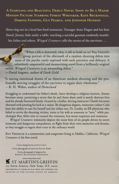 Roy Freirich's novel Winged Creatures intimately depicts the inner lives of five people driven by secret torments and dangerous compulsions, in flight from their own memories and dreams, as they struggle to regain their trust in the ordinary world. The basis for the 2008 film starring Kate Beckinsale and Dakota Fanning. Shots ring out in a local fast food restaurant. Teenager Anne Hagen and her best friend Jimmy hide under a table, watching a suicidal gunman randomly murder her father and others. Winged Creatures tells the stories of the survivors. . . Struggling to understand her father's death, Anne develops a religious hysteria. Jimmy becomes mute, protecting a secret that he and Anne share until it nearly destroys him and his already fractured family. Grazed by a bullet, driving instructor Charlie becomes obsessed with pressing his luck at a casino. By dangerous degrees, restaurant cashier Carla loses her ability to care for herself and her infant son. Dr. Laraby, an ER physician who failed to revive the shooting victims, turns to his wife as someone to "save," while psychologist Ron Abler tries to counsel the witnesses, but meets suspicion and resistance.