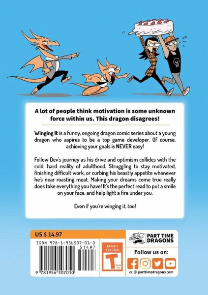 A lot of people think motivation is some unknown force within us. This dragon disagrees! Winging It is a funny, ongoing dragon comic series about a young dragon who aspires to be a top game developer. Of course, achieving your goals is NEVER easy! Follow Dev's journey as his drive and optimism collides with the cold, hard reality of adulthood. Struggling to stay motivated, finishing difficult work, or curbing his beastly appetite whenever he's near roasting meat. Making your dreams come true really does take everything you have! It's the perfect read to put a smile on your face, and help light a fire under you. Even if you're winging it, too! Discover yourself why this hit series by Part Time Dragons is enjoyed daily by nearly half a million readers! Heartwarming & inspiring, stoke your passions with a little dragon fire when you're feeling low!¿ Filled with dragons, humans & many other (adorable) fantasy creatures! In addition to secret comics & a bonus book, get a free game demo to our upcoming dragon RPG! Enjoyed by kids, young adults and adults! Fans of urban fantasy, funny graphic novels, or slice of life manga are sure to love this collection!