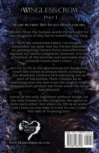 He saw me first. But I'm not meant for him. Stolen from the human world, I'm brought to the kingdom of sky fae to entertain the king. With my memories taken, I no longer remember my past, but my future depends on gaining King Tiane's favor and affection. Against my better judgment, however, it's the attention of the morose and sarcastic High General Voron that I crave. As I try to fit in the glamorous yet dangerous court life, Voron is always there, lurking in the shadows. I believe he's watching me as part of his duties. Then I realize he is watching over me. But even the mighty High General can't protect me from what the king has planned. Voron is the only highborn without wings. I'm the only human in Sky Kingdom. We agree to hate each other, but when my life is at stake and I have no one else to turn to, can I take the risk of trusting him? ____________________________ This book is part 1 of the duet Wingless Crow, set in Marina Simcoe's world of the River of Mists. It ends with a HFN (Happy For Now), but the story of the main characters continues in part 2, Crownless King. ____________________________ Wingless Crow is a Romantic Fantasy with MF romance set in Marina Simcoe's world of the River of Mists. It contains graphic descriptions of intimacy and is intended for mature readers. For a list of TW with potential spoilers, please visit the Wingless Crow page on MarinaSimcoe dot com. ____________________________ Stories set in the world of the River of Mists: Wingless Crow Wingless Crow Crownless King Fire in Stone Fire in Stone Hearts on Fire Serpent's Touch Serpent's Touch Serpent's Claim Madame Tan's Freakshow Call of Water Madness of the Moon Power of Rage NOTE: All duets and trilogies in the River of Mists can be read independently.