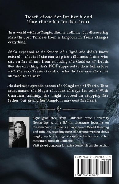 Death chose her for her blood. Fate chose her for her heart. Eighteen-year-old Thea's fate is sealed whether she likes it or not. Magic, a prophecy, and a handsome Fae guardian are determined to place her on the throne of a land she never knew existed. But her father has a different plan, a plan that sets a vengeful goddess free. *** Kieran swore an oath to protect his kingdom and his princess; he just never knew it'd be this difficult. While darkness spreads across the four kingdoms of Faerie, he must train Thea to master the volatile magic coursing through her veins and prepare her for the war lurking on their horizon. But all magic comes at a price. *** As Thea uncovers the truth about her past, prophecies unfold, and a choice arises that could change the kingdom's fate forever. She will do whatever it takes to save her new home and the one she loves-even if the cost is her heart.