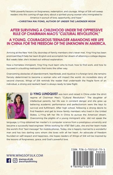 After surviving a childhood under the oppressive rule of Chairman Mao's "Cultural Revolution," a young, courageous teenager abandons her life in China for the freedom of the unknown in America. Arriving at the New York City doorstep of family members she's never met, Ying-Ying has been promised they'll help her learn English and accomplish her dream of attaining a college degree. But weeks later, she's kicked out without explanation. Now a homeless immigrant, Ying-Ying must learn who to trust, how to find work, and how to succeed in a bustling metropolis that looks the other way. Overcoming obstacles of abandonment, heartbreak, and injustice in a foreign land, she remains fiercely determined to become a woman who will impact the world. An incredible story of second chances, Wings of Silk reminds the reader that underneath the fragile form of an individual, a strong and resilient heart is always ready to take flight.