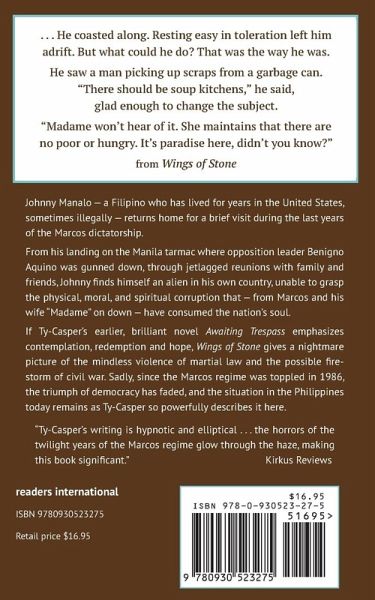 Johnny Manalo-a Filipino who has lived for years in the United States, sometimes illegally-returns home for a brief visit during the last years of the Marcos dictatorship. From his landing on the Manila tarmac where opposition leader Benigno Aquino was gunned down, through jetlagged reunions with family and friends, Johnny finds himself an alien in his own country, unable to grasp the physical, moral, and spiritual corruption that--from Marcos and his wife "Madame" on down--have consumed the nation's soul. If Ty-Casper's earlier, brilliant novel Awaiting Trespass emphasizes contemplation, redemption and hope, Wings of Stone gives a nightmare picture of the mindless violence of martial law and the possible fire-storm of civil war. Sadly, since the Marcos regime was toppled in 1986, the triumph of democracy has faded, and the situation in the Philippines today remains as Ty-Casper so powerfully describes it here.
