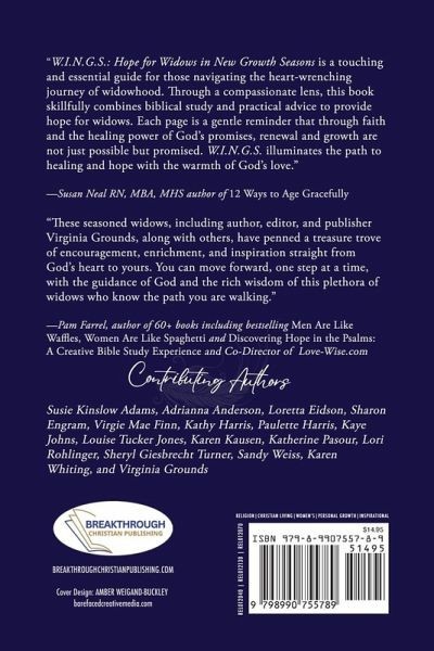 W.I.N.G.S.: Hope for Widows in New Growth Seasons is a touching and essential guide for those navigating the heart-wrenching journey of widowhood in stories written by widows. Through a compassionate lens, this book skillfully combines biblical study and practical advice to provide hope for widows. The exploration of 'Widow Brain' is enlightening, offering much-needed clarity and understanding about the emotional and cognitive impacts of profound loss. Each page is a gentle reminder that through faith and the healing power of God's promises, renewal and growth are not just possible but promised. W.I.N.G.S illuminates the path to healing and hope for moving forward with the warmth of God's love. Author Contributors: Susie Kinslow Adams, Adrianna Anderson, Loretta Eidson, Sharon Ingram, Vigie Mae Finn, Virginia Grounds, Kathy Harris, Paulette Harris, Kaye Johns, Louise Tucker Jones, Karen Kausen, Katherine Pasour, Lori Rohlinger, Sheryl Giesbrecht, Sandy Weiss, Karen Whiting