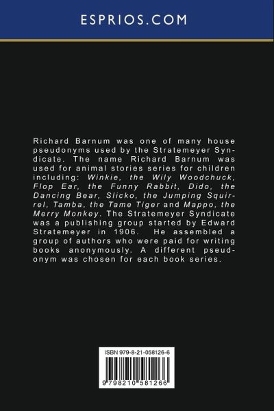 Richard Barnum was one of many house pseudonyms used by the Stratemeyer Syndicate. The name Richard Barnum was used for animal stories series for children including: Winkie, the Wily Woodchuck, Flop Ear, the Funny Rabbit, Dido, the Dancing Bear, Slicko, the Jumping Squirrel, Tamba, the Tame Tiger and Mappo, the Merry Monkey. The Stratemeyer Syndicate was a publishing group started by Edward Stratemeyer in 1906. He assembled a group of authors who were paid for writing books anonymously. A different pseudonym was chosen for each book series.