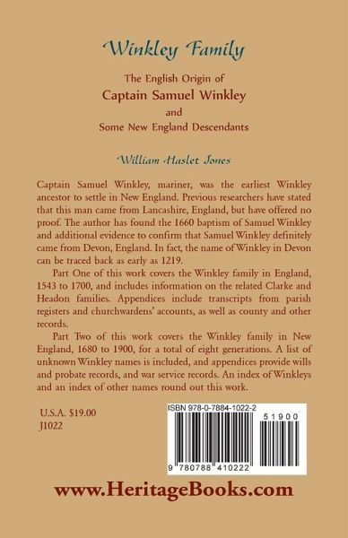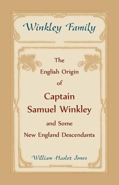 Captain Samuel Winkley, mariner, was the earliest Winkley ancestor to settle in New England. Previous researchers have stated that this man came from Lancashire, England, but have offered no proof. The author has found the 1660 baptism of Samuel Winkley and additional evidence to confirm that Samuel Winkley definitely came from Devon, England. In fact, the name of Winkley in Devon can be traced back as early as 1219. Part One of this work covers the Winkley family in England, 1543 to 1700, and includes information on the related Clarke and Headon families. Appendices include transcripts from parish registers and churchwardens' accounts, as well as county and other records. Part Two of this work covers the Winkley family in New England, 1680 to 1900, for a total of eight generations. A list of unknown Winkley names is included, and appendices provide wills and probate records, and war service records. An index of Winkleys and an index of other names round out this work.