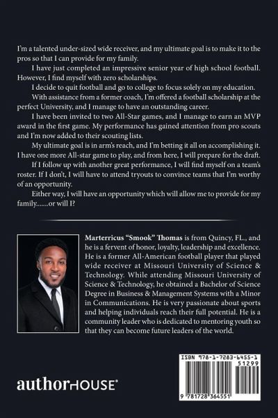 I'm a talented under-sized wide receiver, and my ultimate goal is to make it to the pros so that I can provide for my family. I have just completed an impressive senior year of high school football. However, I find myself with zero scholarships. I decide to quit football and go to college to focus solely on my education. With assistance from a former coach, I'm offered a football scholarship at the perfect University, and I manage to have an outstanding career. I have been invited to two All-Star games, and I manage to earn an MVP award in the first game. My performance has gained attention from pro scouts and I'm now added to their scouting lists. My ultimate goal is in arm's reach, and I'm betting it all on accomplishing it. I have one more All-star game to play, and from here, I will prepare for the draft. If I follow up with another great performance, I will find myself on a team's roster. If I don't, I will have to attend tryouts to convince teams that I'm worthy of an opportunity. Either way, I will have an opportunity which will allow me to provide for my family.......or will I?