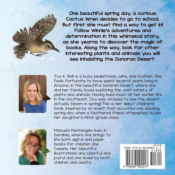 Get your little one excited about all the fun that school can offer in this fast-paced adventure with a curious Cactus Wren named Winnie! Winnie is determined to see what the children are doing inside the four walls of the school. She just needs to find a way to get inside! Winnie discovers tasty treats, books full of stories, new friends, and the joy of learning as she manages to find her way into both the school and the hearts of the people there. Readers will fall in love with the cute bird character, the brightly colored and gorgeously detailed illustrations, and the Bonus Fun Facts about the Sonoran Desert at the end of the story. Teach your child the joy of books and life-long learning and that school is a happy place to be. Grab your copy and snuggle up together for a great read-aloud experience. Don't forget to check out Winnie's second adventure, Winnie's Christmas Treasure Hunt!