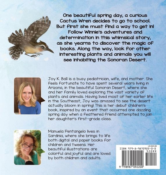 Get your little one excited about all the fun that school can offer in this fast-paced adventure with a curious Cactus Wren named Winnie! Winnie is determined to see what the children are doing inside the four walls of the school. She just needs to find a way to get inside! Winnie discovers tasty treats, books full of stories, new friends, and the joy of learning as she manages to find her way into both the school and the hearts of the people there. Readers will fall in love with the cute bird character, the brightly colored and gorgeously detailed illustrations, and the Bonus Fun Facts about the Sonoran Desert at the end of the story. Teach your child the joy of books and life-long learning and that school is a happy place to be. Grab your copy and snuggle up together for a great read-aloud experience. Don't forget to check out Winnie's second adventure, Winnie's Christmas Treasure Hunt!