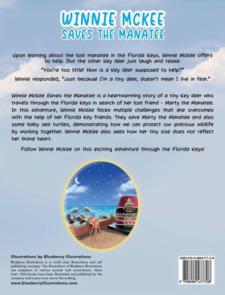 In the sunny Florida Keys, where the skies are always blue, the waters calm, and the breezes warm, lives a tiny Key deer named Winnie McKee. At just a foot tall, she may be small, but her heart is as big as the ocean. Through her adventure, Winnie shows that size does not matter when it comes to having a big heart and making a difference in the Florida Keys. One day, while Winnie was munching on leaves at the Key Deer Refuge in Big Pine, two distressed manatees approached her. They were searching for their lost friend, Marty the Manatee. It turns out Marty had wandered off on an adventure of his own and was in trouble. Determined to help, Winnie embarks on a quest through the Florida Keys to find Marty and reunite him with his worried family. She meets some quirky and helpful friends along the way, from Armand the pie-loving rooster in Key West to a friendly hawk on Seven Mile Bridge, and even a pair of dolphins in Marathon. With their assistance, Winnie tracks down Marty and prevents a dangerous situation. But Winnie's adventure does not end there. In Islamorada, she discovers some newly hatched baby sea turtles who are disoriented by porch lights. With Marty's help, they guide the little sea turtles back to the safety of the ocean. In this adventure, Winnie McKee faces multiple challenges that she overcomes with the help of her Florida Key friends. They save Marty the Manatee and also some baby sea turtles, demonstrating how we can protect our precious wildlife by working together. Winnie McKee also sees how her tiny size does not reflect her brave heart. Together, the friends then celebrate their successful rescue with a slice of Key lime pie in the heart of Mallory Square, where the sunsets are as sweet as their victory. "Friends in the Keys are the best indeed!" Follow Winnie McKee on this exciting adventure through the Florida Keys.