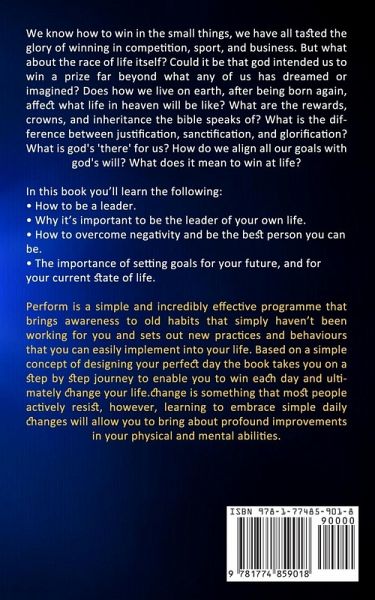 We know how to win in the small things, we have all tasted the glory of winning in competition, sport, and business. But what about the race of life itself? Could it be that god intended us to win a prize far beyond what any of us has dreamed or imagined? Does how we live on earth, after being born again, affect what life in heaven will be like? What are the rewards, crowns, and inheritance the bible speaks of? What is the difference between justification, sanctification, and glorification? What is god's 'there' for us? How do we align all our goals with god's will? What does it mean to win at life? In this book you'll learn the following:How to be a leader. Why it's important to be the leader of your own life. How to overcome negativity and be the best person you can be. The importance of setting goals for your future, and for your current state of life. Perform is a simple and incredibly effective programme that brings awareness to old habits that simply haven't been working for you and sets out new practices and behaviours that you can easily implement into your life. Based on a simple concept of designing your perfect day the book takes you on a step by step journey to enable you to win each day and ultimately change your life.change is something that most people actively resist, however, learning to embrace simple daily changes will allow you to bring about profound improvements in your physical and mental abilities.